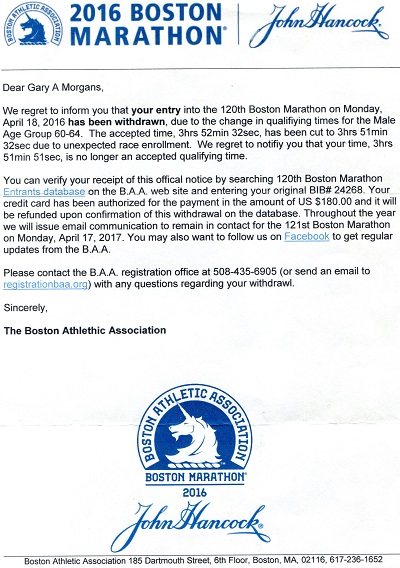 See this letter, which I received in an official-looking Boston Marathon envelope about two weeks before the race—right around April Fools Day. For about a half hour, I was convinced I was now a spectator, all because I had stopped for a sip of Hamm’s beer at mile 25 and lost twenty seconds. This is what happens when your birthday is April 1.