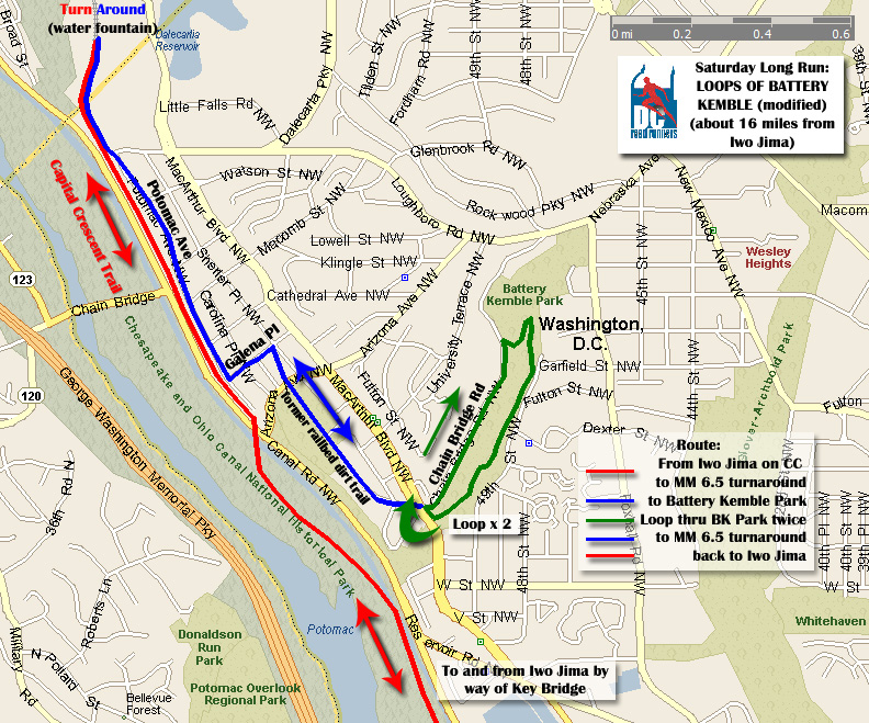 Directions: From Iwo Jima, go through Rosslyn and cross Key Bridge. Take a sharp right after the bridge down to river side of C&O Canal. Turn right (go under Key Bridge) and run for miles!